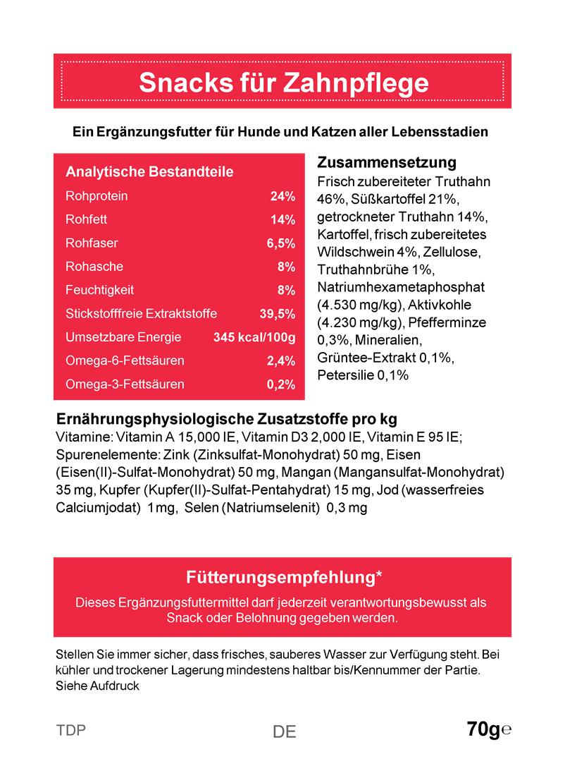 Composition: Freshly prepared turkey 46%, sweet potato 21%, dried Turkey 14%, potato, freshly prepared wild boar 4%, cellulose, Turkey broth 1%, sodium hexametaphosphate (4,530 mg/kg), Activated carbon (4,230 mg/kg), peppermint 0.3%, minerals, Green tea extract 0.1%, parsley 0.1%