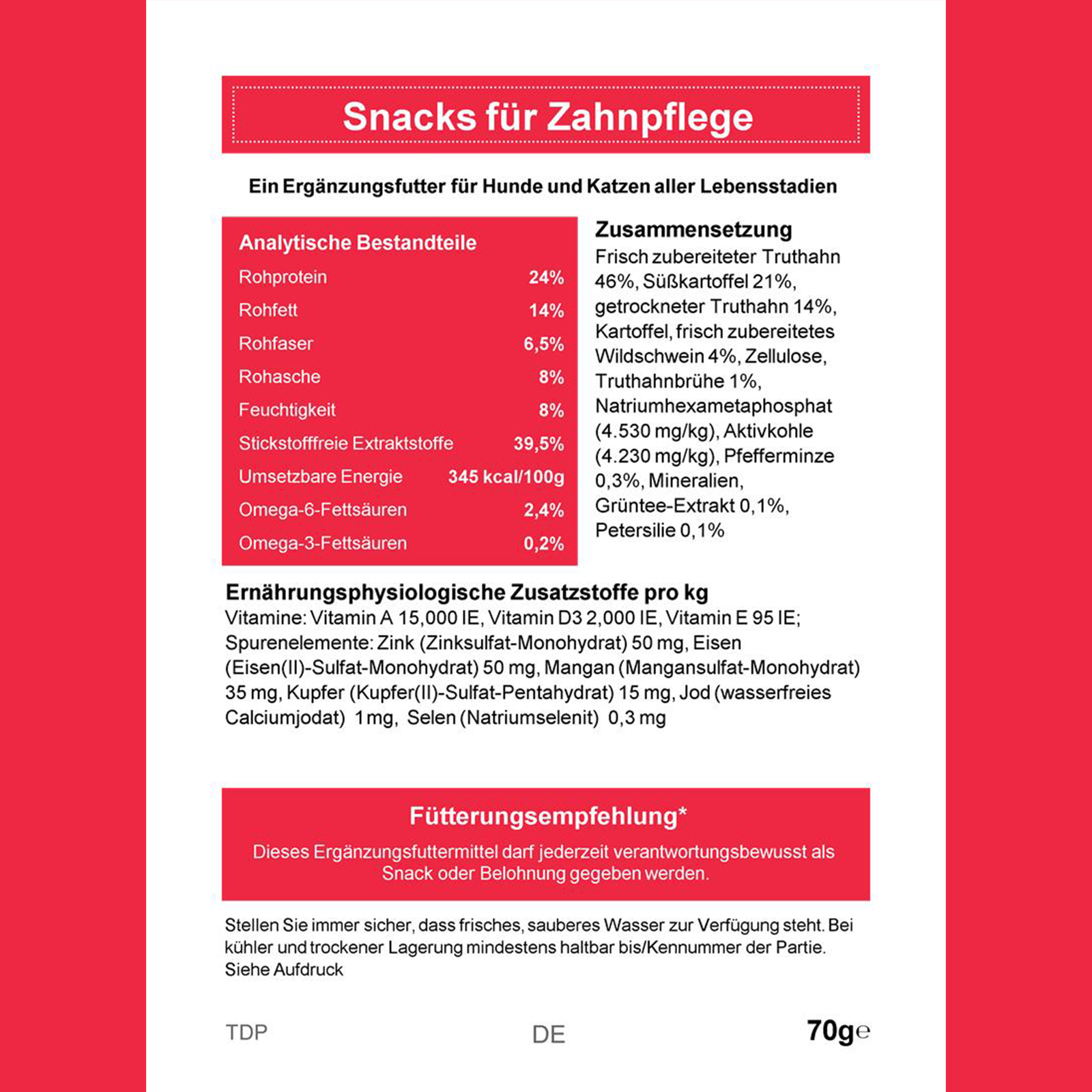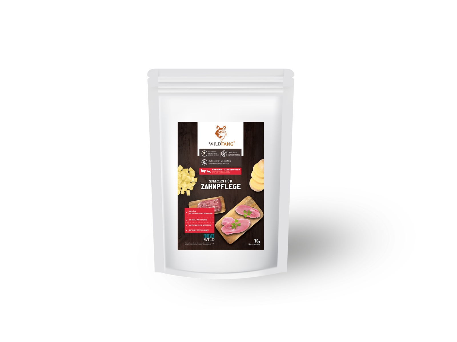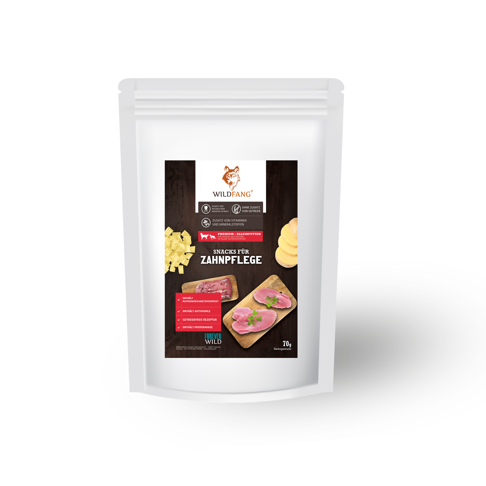 Does your four-legged friend tend to have bad breath and tartar buildup? Then our Wildfang® dental care snacks are just right for your dog. Tartar can form on our pets' teeth, which can lead to bad breath. Our dental care snacks reduce tartar formation and promote good oral hygiene. It contains, among other things, a natural green tea extract, peppermint and activated charcoal to minimize bacteria and combat bad breath. The activated charcoal also promotes the maintenance of white teeth.